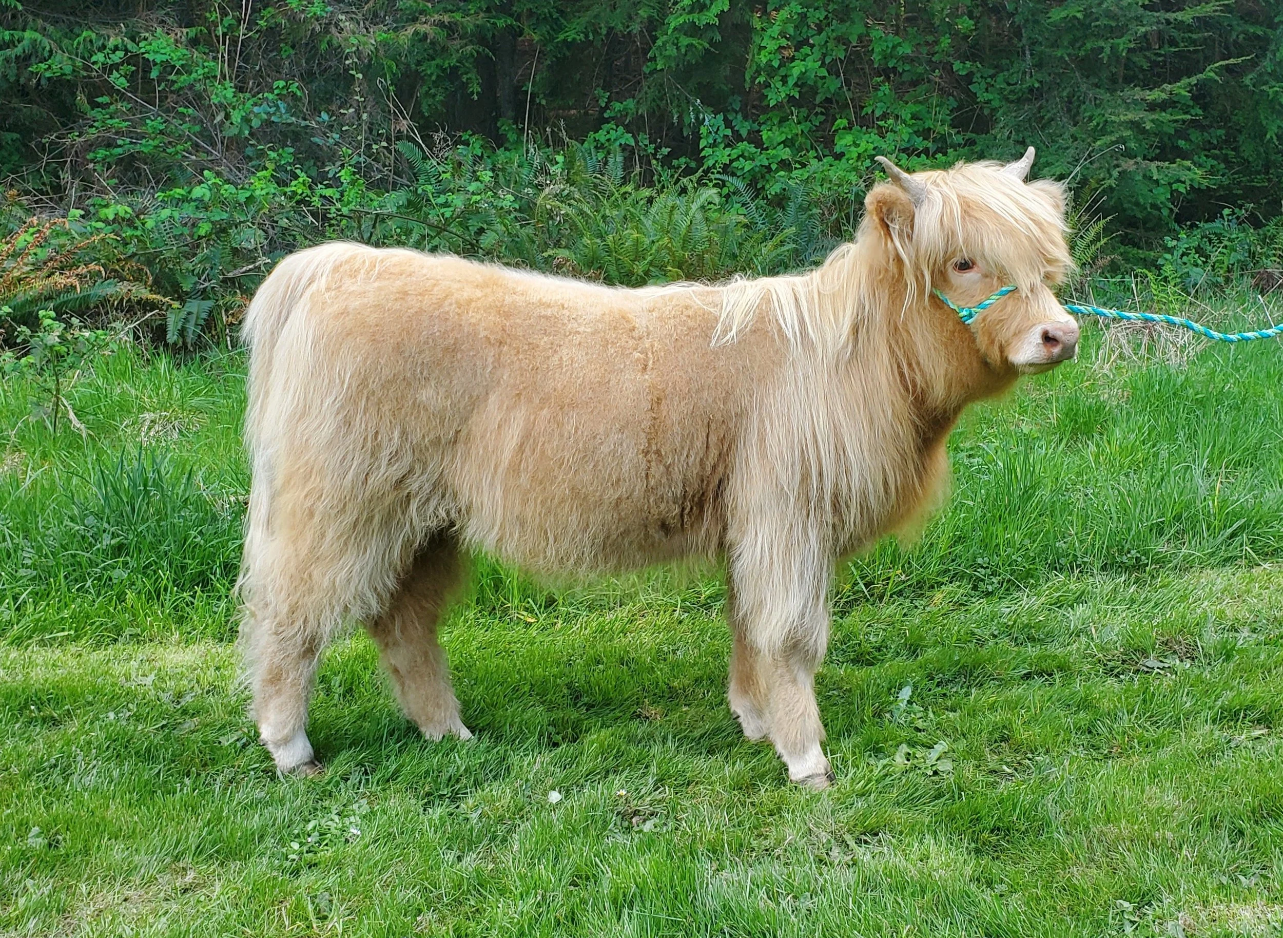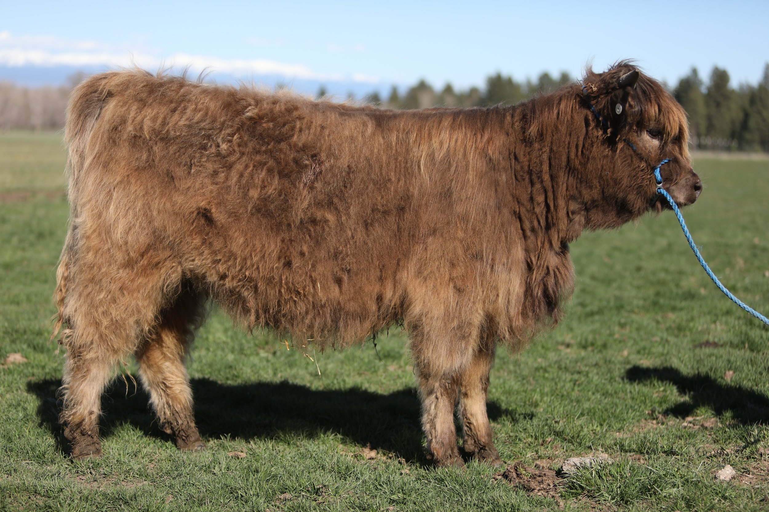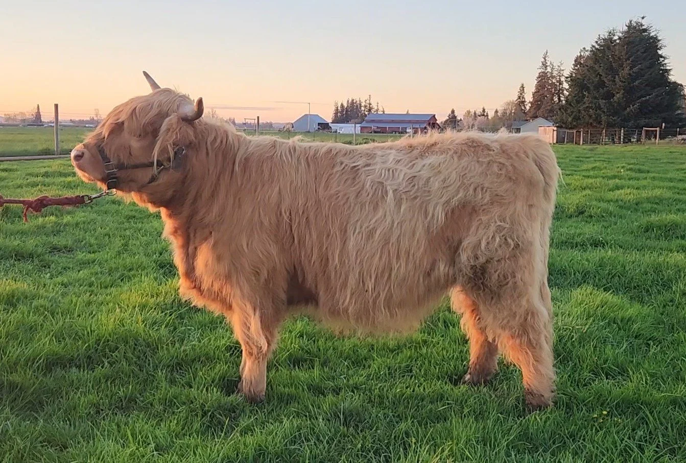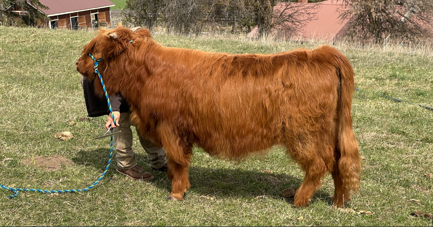 COPA Farms is proud to offer CPF Ricochet. Ricki’s pedigree is packed with functional, maternal traits and longevity. She is built right from the ground up with great hoof, leg and hip structure, nice depth and spring of rib, exceptional udder and a feminine head and neck. To top it off, Ricki has an excellent disposition. She is confident without being pushy and enjoys human interaction. She has been hands down our easiest calf to work with whether it be halter training or in the chute for tattoos and vaccines. She is well started on halter and wouldn’t take much work to get her show ready. Ricki’s dam, SKM Lucy, is a fun cross of PNW genetics. She has several farms that we value in our pedigrees including Five Star, Flathead and Valhalla. Ricki is Lucy’s first calf and she had a textbook delivery and had Ricki up and nursing within 30 minutes. Lucy’s maternal traits were passed down from her dam, Rustler’s Bestla. Bestla had her last calf at 18 years old, still sporting an excellent udder and maintenance free hooves. We have another cow in our herd that is closely related to Bestla that will be 17 this year and is our herd matriarch. Longevity is in Ricki’s genes, but it doesn’t stop at her dams side. Ricki is sired by our up-and-coming bull, Gus of Flatland Farm. This is our first calf crop from Gus and we have been impressed so far. His calves are very vigorous and come out ready to take on the world. They are inheriting his correct hoof, leg and hip structure, his excellent depth of rib and a confidence that makes them fun to work with. Gus is sired by EZ Acres Kyle, who needs no introduction so we will focus on the females in his pedigree. Starting with his maternal granddam, Almosta Farm’s Britt. Britt is an impact dam and has calved each consecutive year for a total of 12 calves. Britt has been a driving force for Flatland Farm who has retained 5 of her heifer calves to build their program. One of those females is Gavina of Flatland Farm, Gus’s dam. Gavina is also an impact dam and has calved every year including her 10th calf earlier this year. Gavina is sired by Skye High Wayward Son who has had a significant impact on the breed with many productive progeny. With her lineage and conformation, Ricki should make an efficient and productive heifer that will fit into any program. We are a forage-based system so Ricki has been raised on grass, local haylage, minerals and good old PNW (liquid) sunshine. Fully vaccinated and boosted including bangs and nt821 negative through parent testing. Ricki is a moderate heifer and we expect she will mature around 900 pounds. As you can see from her current pictures and video, Ricki is ready for summer and has shed most of her winter coat. Not to worry, she grows a luscious, blond coat in the winter and is not prone to pests or skin irritations like some of her highland counterparts. While we expect Ricki will excel anywhere in the country we are offering free delivery if her final destination is within 500 miles of our farm as an incentive to PNW buyers.